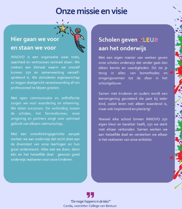 De Broederschool is één van de scholen van INNOVO Onderwijs Op Maat. INNOVO is de koepelorganisatie van ruim 40 scholen voor primair onderwijs in Zuid- en Midden Limburg. Ruim 9000 leerlingen bezoeken onze scholen.